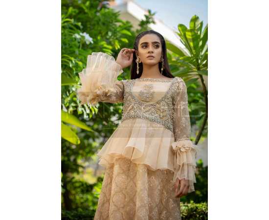 - feather pleated sleeves & a unique cut on embroidered organza. elegance.