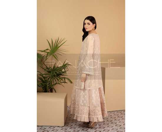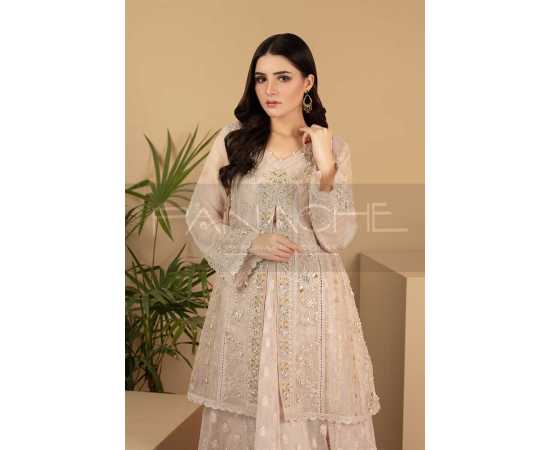 - It has a double layer style with midi length peplum style gown over a long maxi dress. Tailored in fully embroidered & pure quality fabric — It has been detailed with pleats, borders & embellishments. The adornments include gorgeous craftwork of kora dabka & pearls.