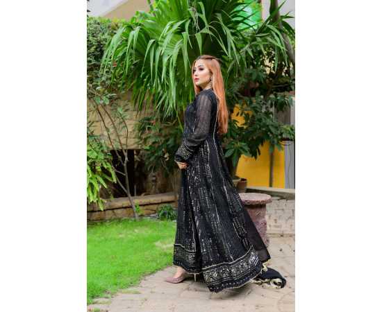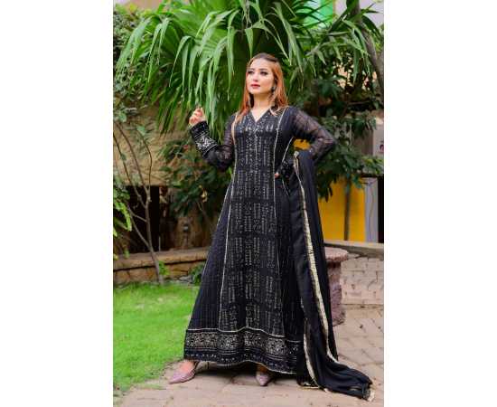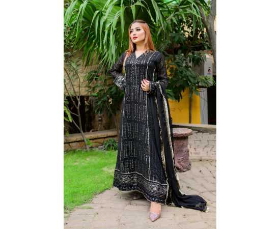 (Ma-29) - Embroidered Dress For Women 3Pcs Suit - Black
