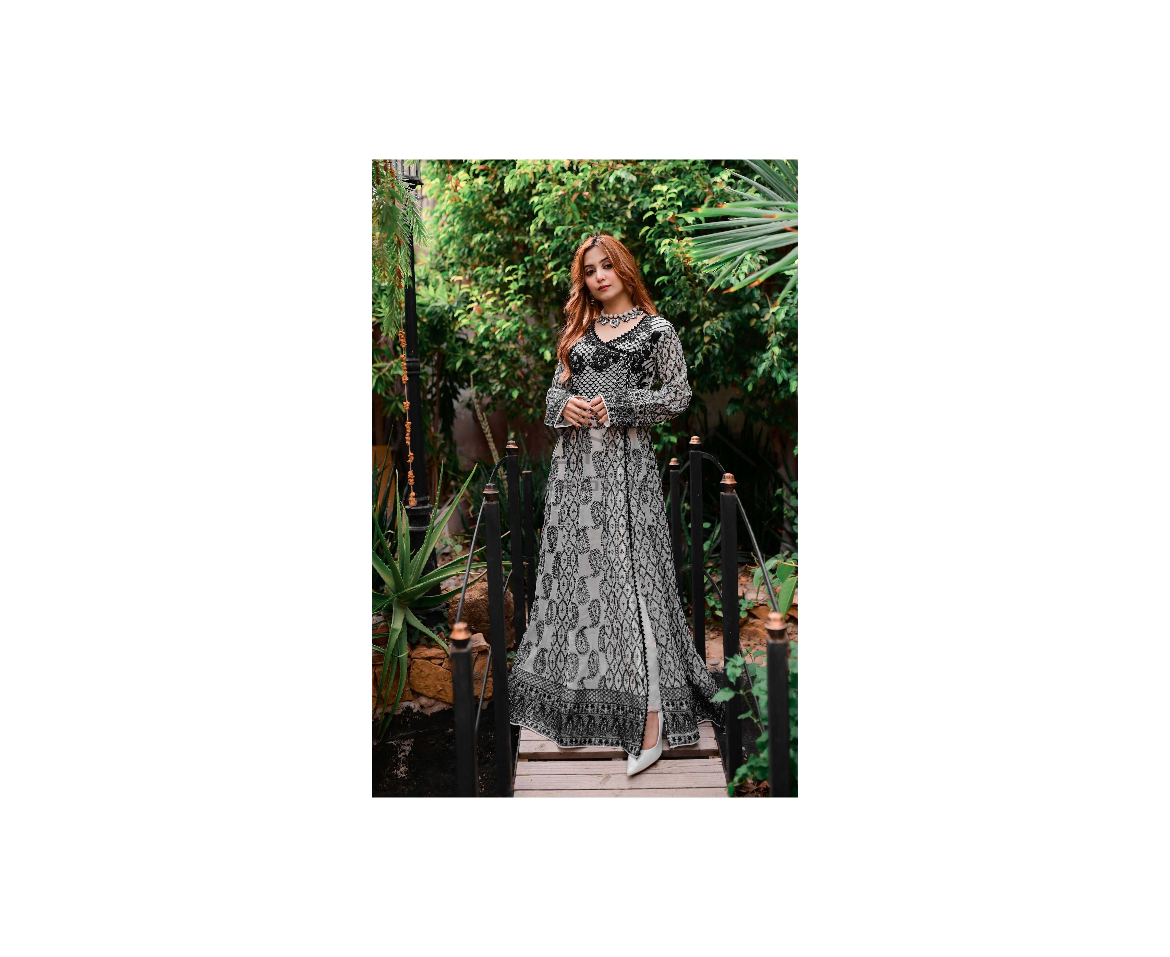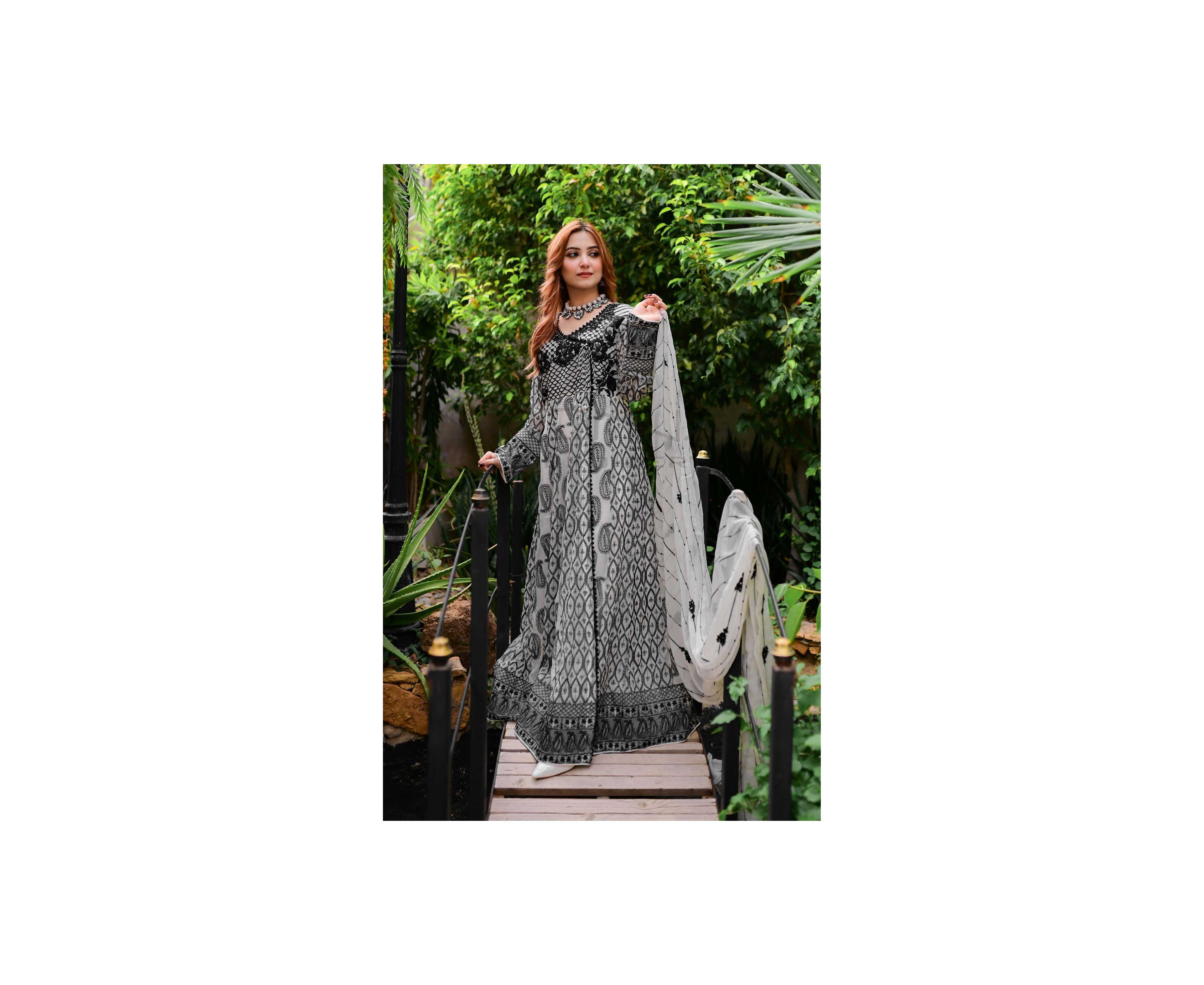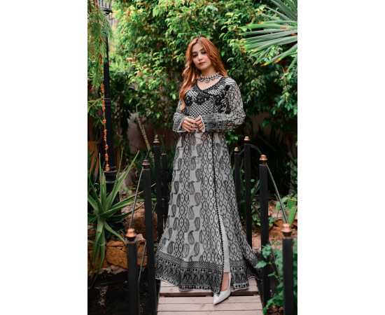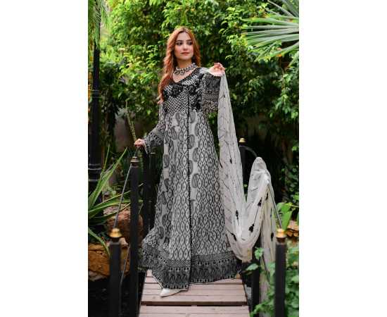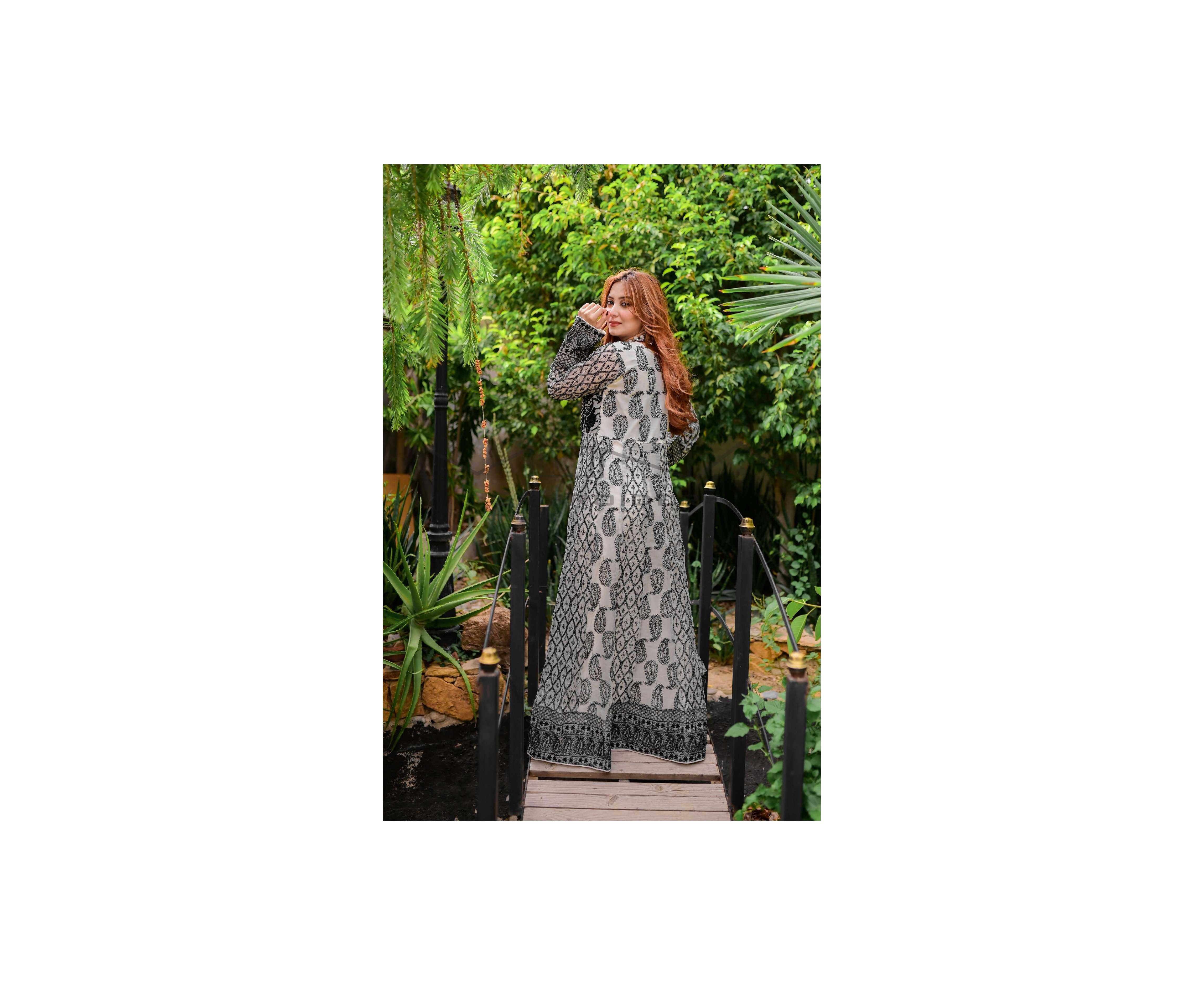 (Ma-32) - Embroidered Dress For Women 3Pcs Suit - White & Black