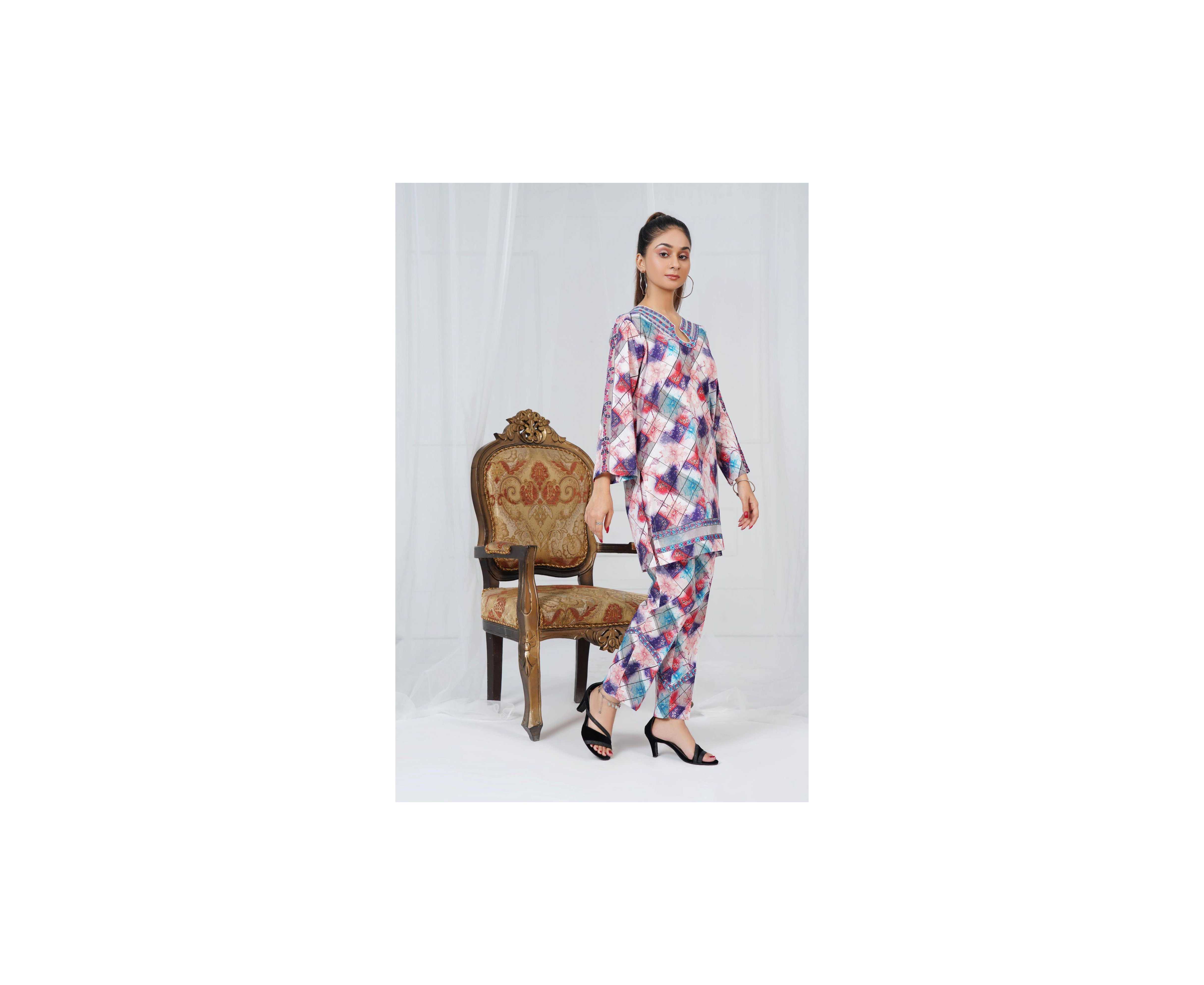 Embroidered Neck and Sleeves Tear Neck Leaves Print 2-Piece Stitched Suit - Multi Color