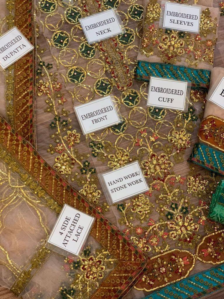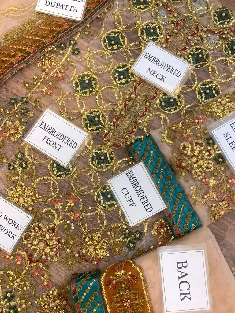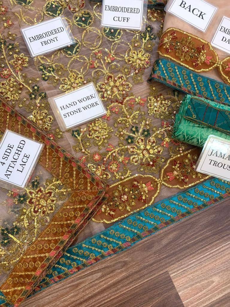- NET FULLY HEAVY EMBROIDERED FRONT EMBELISH WITH HANDWORK ALONG WITH EMBROIDERED NECK PATCH AND EMBROIDERED DAMAN PATCHES (2PCS) GIVEN SEPERATELY