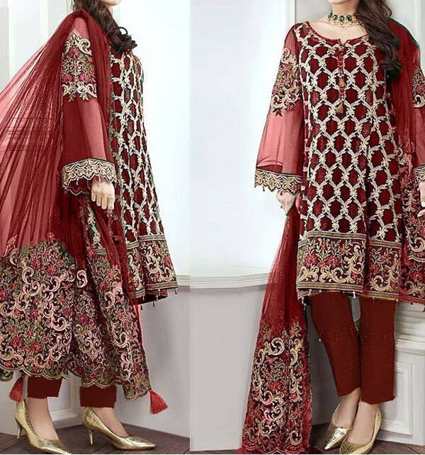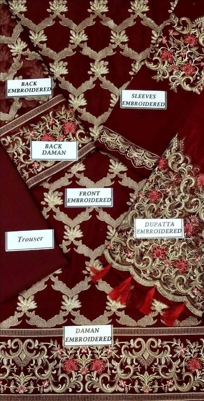 Heavy Embroidered 3 PCS Women Unstitched Suit - Red - Ra-43