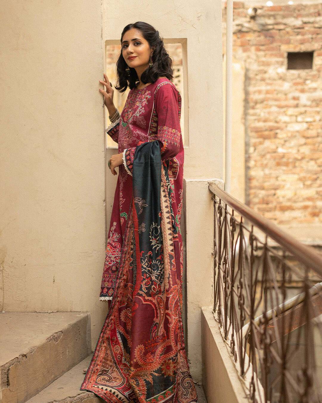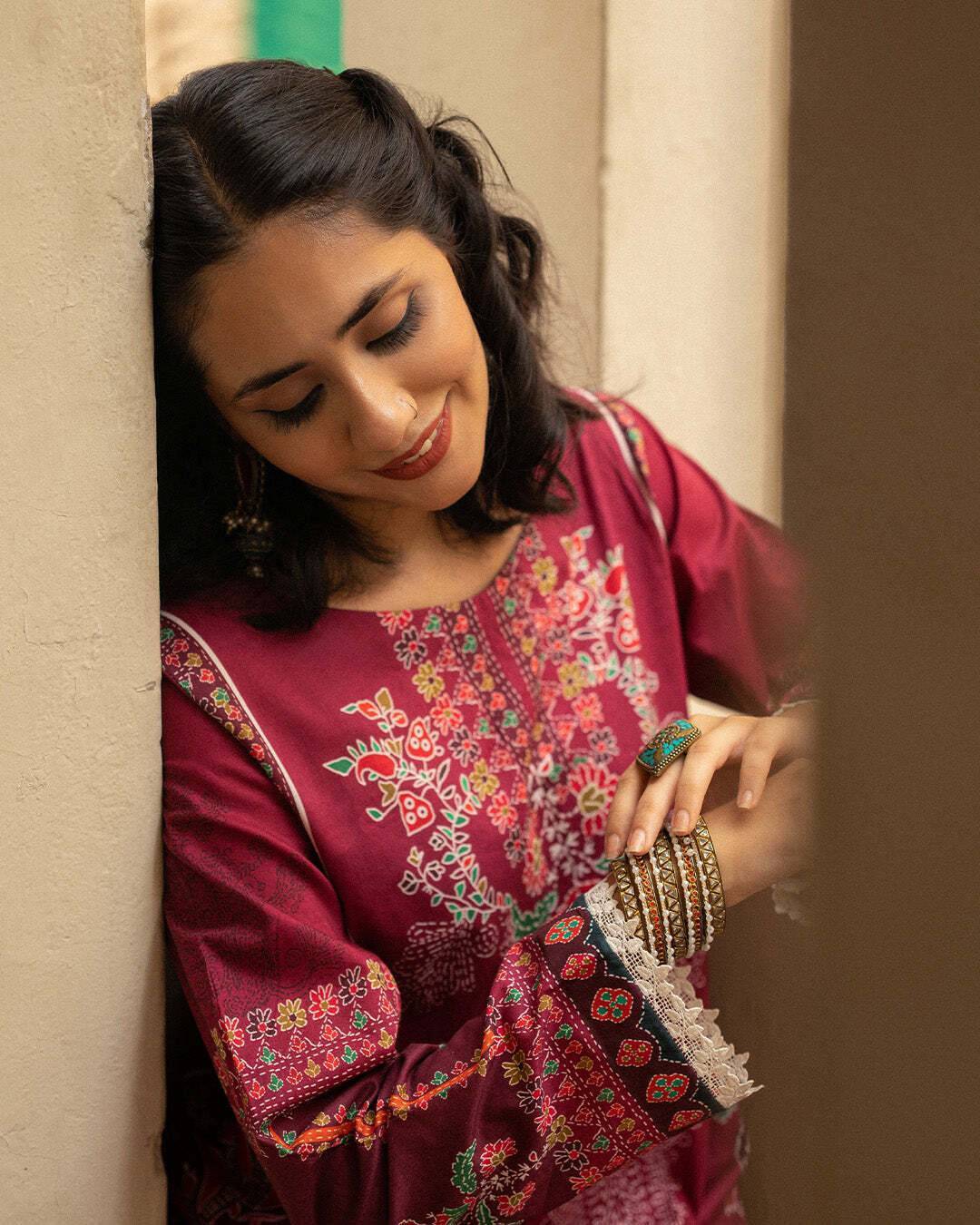 - Â a captivating magenta dress paired with an intricately designed jacquard dupatta.Â
