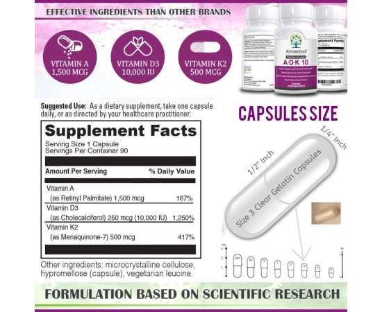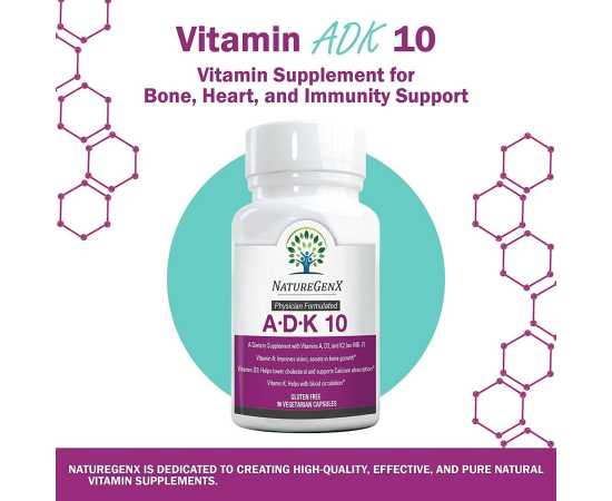 - Vitamin ADK 10 supplement for proper calcium absorption, bone structure support, stronger teeth, heart health, cardiovascular function, and cholesterol lowering