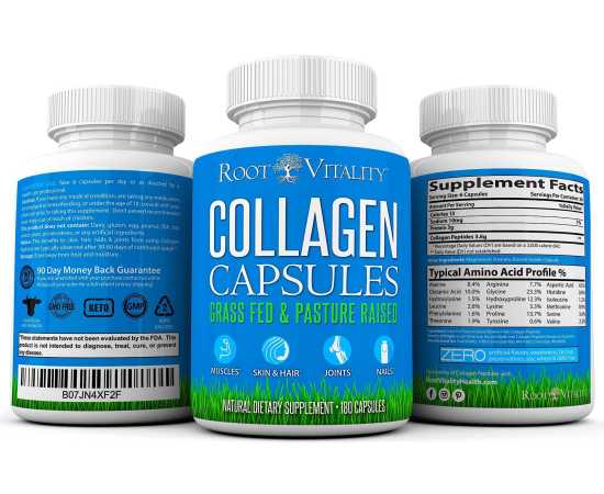 - Everything you need in a collagen supplement: Grass Fed & Pasture Raised Collagen 100% Pure Collagen Peptides (ZERO additives) Free of Growth Hormones & Antibiotics Unflavored & Odorless Potent Source of Amino Acids & Protein Keto & Paleo Protein Capsule Easy to Swallow Capsule Collagen Pills with No Smell or Aftertaste Anti-Aging Supplement Firms & tightens skin which can reduce wrinkles, cellulite & stretch marks* Increase natural collagen levels which can reduce joint pain & degeneration of joints* Our Root Vitality Collagen Capsule provide you with 650 mg of pure collagen per capsule