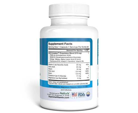 - G-H3 Complex Proprietary Blend (275mg): PABA (p-Aminobenzoic Acid, DMAE (2-Dimethylaminoethanol Bitartrate), Ginkgo Biloba, R-Alpha Lipoic Acid, Coenzyme Q10, Acetyl-L-Carnitine, Vitamin B6