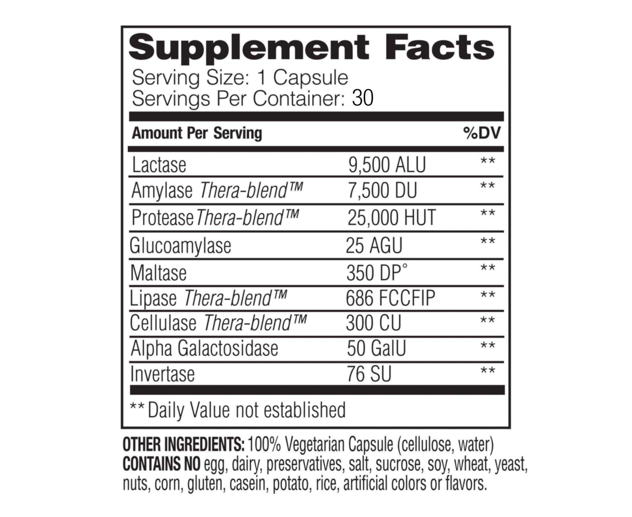 - Lactase, Amylase Thera-Blend, Protease Thera-Blend, Glucoamylase, Maltase, Lipase Thera-Blend, Cellulase Thera-Blend, Alpha Gatactosidase, Invertase