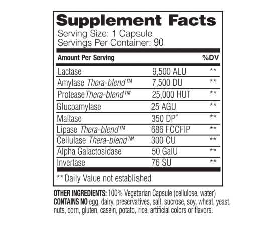 - Lactase, Amylase Thera-Blend, Protease Thera-Blend, Glucoamylase, Maltase, Lipase Thera-Blend, Cellulase Thera-Blend, Alpha Gatactosidase, Invertase