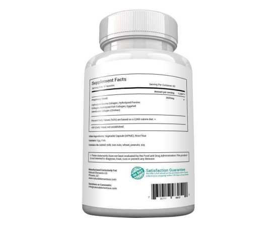 - Hydrolyzed Bovine Collagen, Hydrolyzed Porcine Collagen, Hydrolyzed Fish Collagen, Eggshell Membrane Collagen (Chicken) Vegetable Capsule (HPMC), Rice Flour