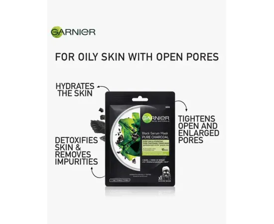 - Prevent breakouts and keep your face clean with the Garnier Skin Naturals Charcoal Face Serum Sheet Mask. Its charcoal-infused serum formula helps purify your skin by removing dirt, toxins, impurities, and pollutants. With just 15 minutes of wearing this dermatologically tested mask, your skin can get deep hydration and a natural shine.