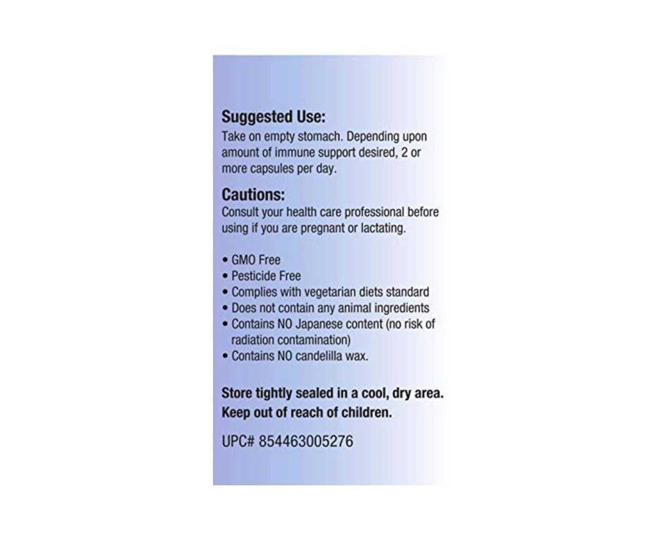 - o wax-free filler, 100% active material vegetarian Capsule polysaccharide content exceeds 50% and acetylated alpha-glucan exceeds 25% Proprietary ratio specific blend derived from Agaricus blazei sporophor, Hericium erinaceus, black fungus, Ganoderma lucidum, Maitake , Shiitake NON-GMO NON-IRRADIATED PNO Waste - safe water extraction NOT contained in Japan - no risk of radiation contamination Meets standard vegetarian diets Superior strength but no gastrointestinal discomfort that can occur from the use of fillers