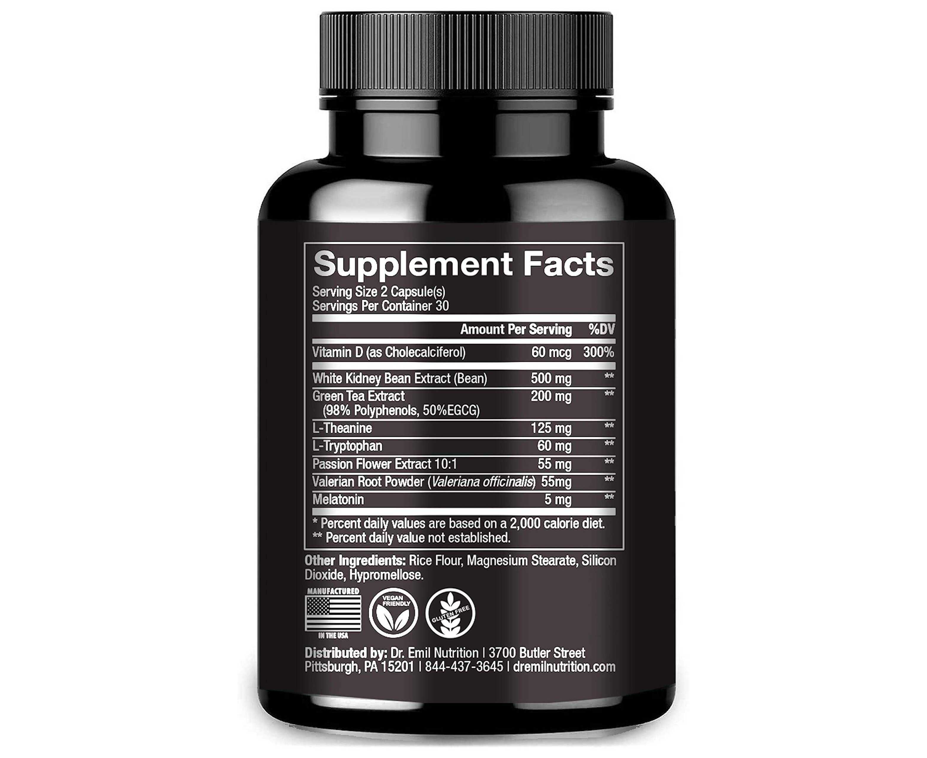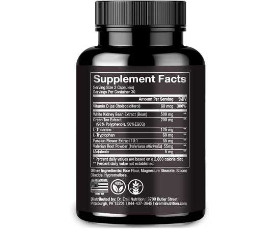 - White Kidney Extract Powder, Green Coffee Extract, Ltheanine, Ltryptophan, Valerian Root Extract, Passion Flow Extract, Melatonin