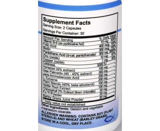 - Serving Size 2 Capsule Servings Per Container 30 Amount Per Serving Daily Value Vitamin B6 (As Pyridoxine Hydrochloride) 10 Mg 500% Folic Acid 400 Mcg 100% Biotin 300 Mcg 100% Pantothenic Acid (As Calcium Pantothenate) 300 Mg 3000% Zinc (Oxide) 10 Mg 67% Copper (Oxide) 1 Mg 50% Catalase 5000 Iu Horsetail (7% Extract) 100 Mg Saw Palmetto (45% Extract) 300 Mg Paba (Paraaminobenzoic Acid) 200 Mg L Tyrosine 200 Mg Plant Sterols (45% Betasitosterol) 100 Mg Nettle Root Extract 100 Mg Chlorophyll 10 Mg Fo Ti (Powder) 10 Mg Barley Grass 10 Mg Daily Value Not Established Other Ingredients Gelatin, Magnesium Stearate And Silicon Dioxide