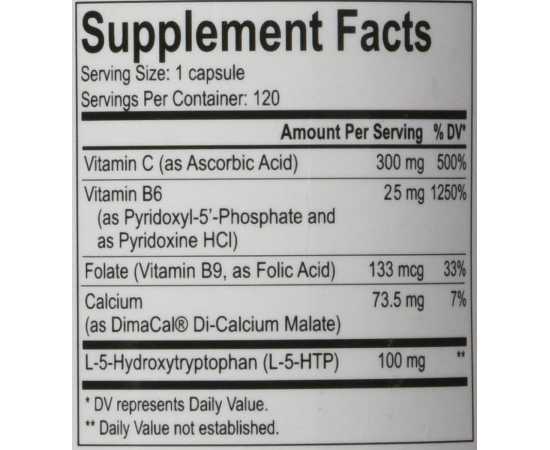 - Vitamin C Ascorbic Acid (300 Mg, 500%), Vitamin B6 Pyridoxal As 5Phosphate And Pyridoxine Hci (25 Mg, 1250%), Folate Vitamin B9 As Folic Acid (133 Mcg, 33%), Calcium As Citrate (74 Mg, 7%), L5 Hydroxtryptophan L5Htp (100 Mg)