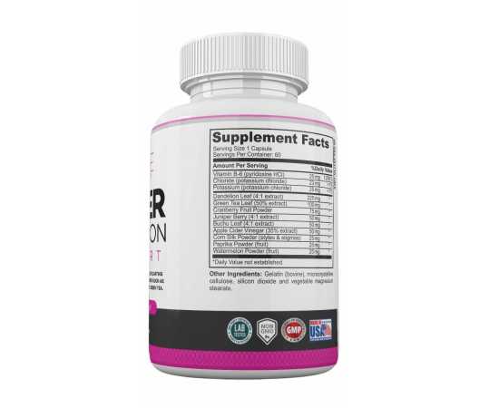 - Vitamin B6 25Mg, Chloride 23 Mg, Potassium 25Mg, Dandelion Leaf 225Mg, Green Tea Leaf 100Mg, Cranberry Fruit Powder 75Mg, Juniper Berry 50Mg, Buchu Leaf 50Mg, Apple Cider Vinegar 50Mg, Corn Silk Powder 25Mg, Paprika Powder 25Mg, Watermelon Powder 25Mg