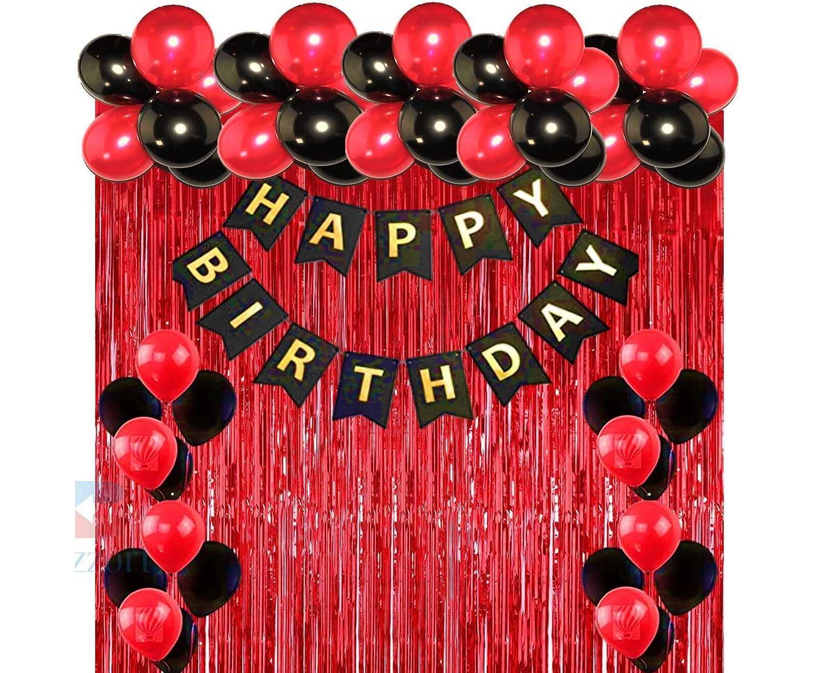 - Happy Birthday Banner, Foil Curtains, 30 shining Balloons (15 Red & 15 Black)