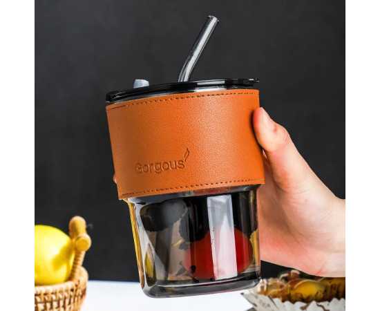 450Ml Glass Tumbler With Straw, Lid & Leather Sleeve
