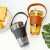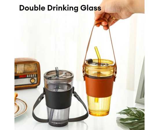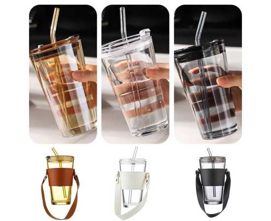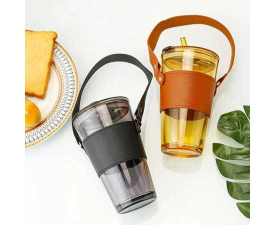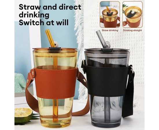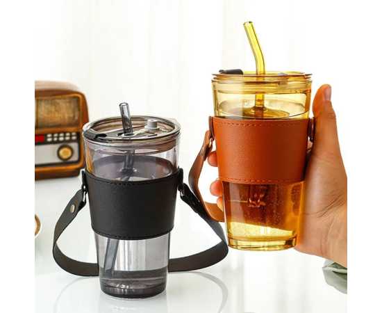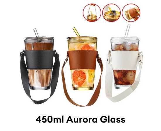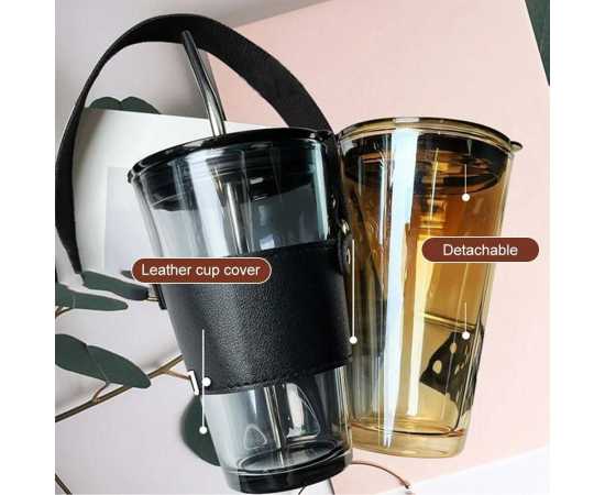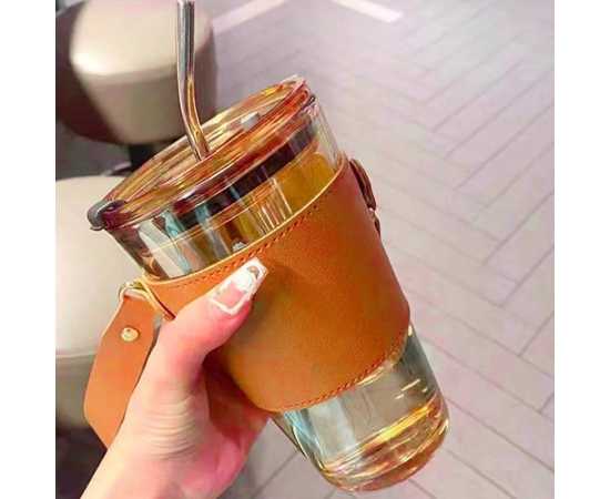 Glass Tumbler With Straw Lid Handle With Protective Leather Sleeve - 450Ml