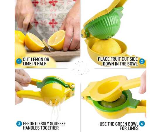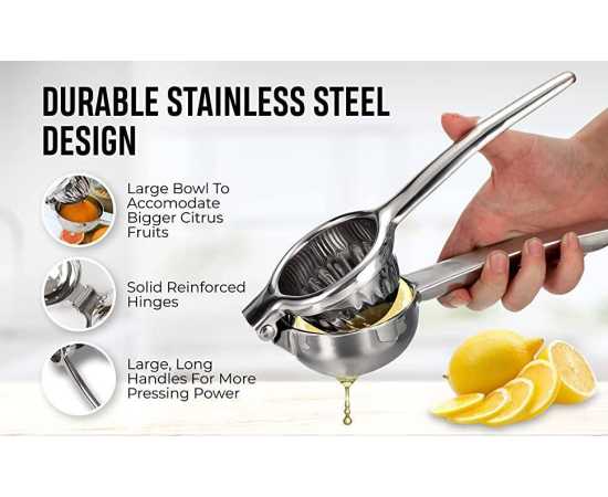 - Material: Heavy Stainless Steel This citrus squeezer in leverage design, meets the ergonomics practices, gets every last drop out of lemons, limes and oranges quickly with ease, while saving your energy, time and efforts.