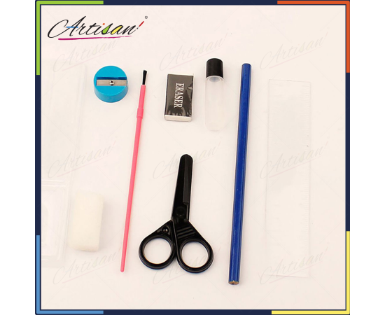 - 1 Pencil, 1 Brush, 1 Sharpener, 1 Scissors,Â