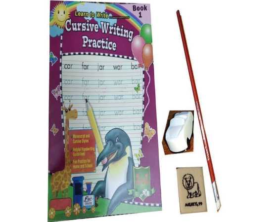 Pack of Cursive Writing Practice Book # 1 with 1 Pencil, Eraser & Sharpener