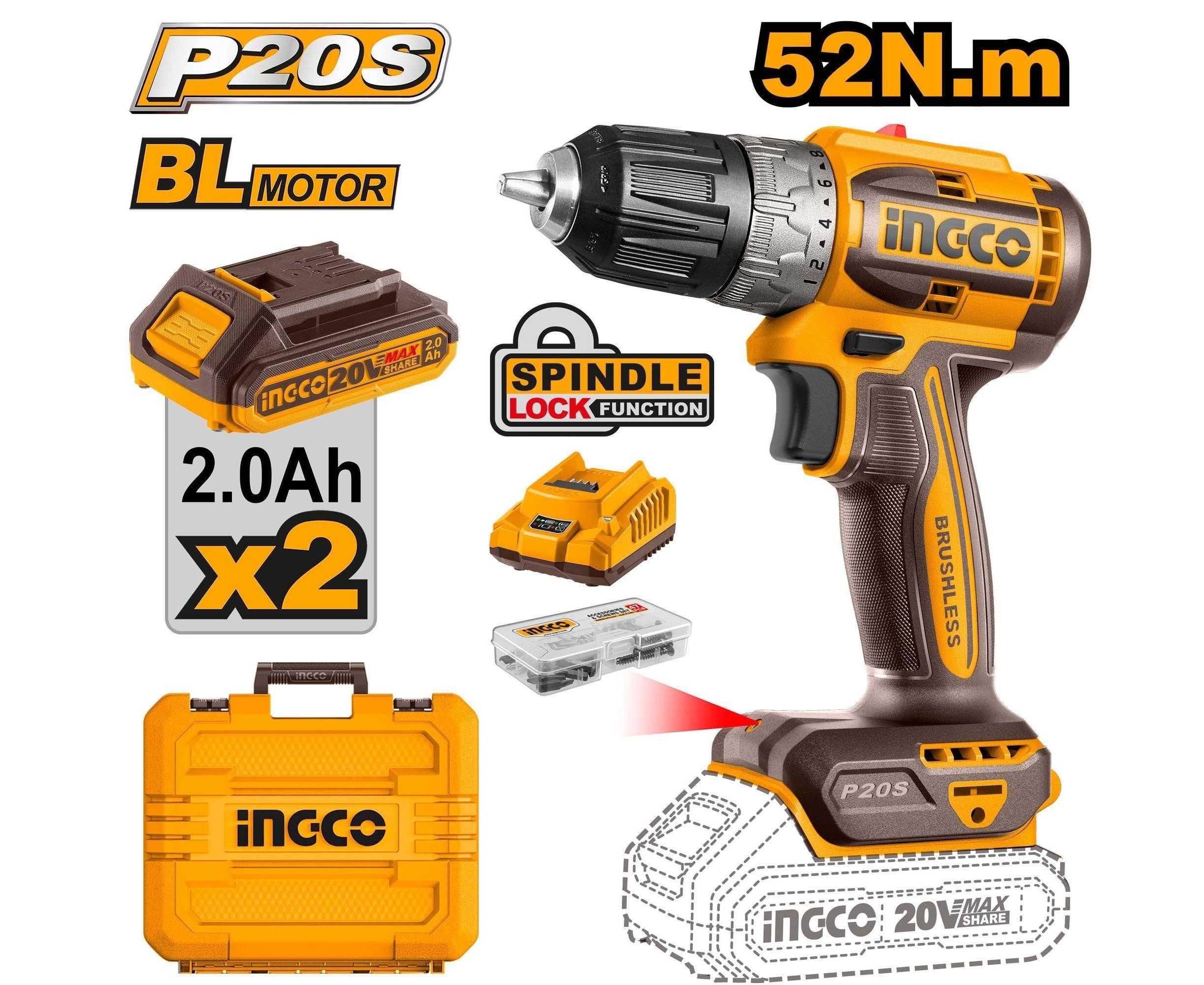 - AT - Ingco CDLI20453 Brushless Cordless Drill Charger Battery Included