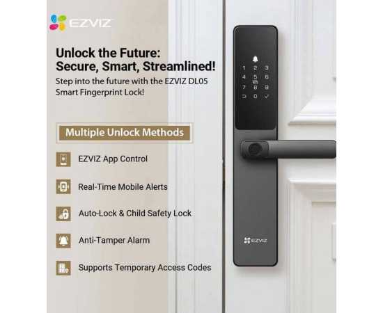 - Ezviz DL05 Smart Fingerprint Lock, Aluminum alloy, Multiple Unlock Methods, Real-Time Mobile Alerts,