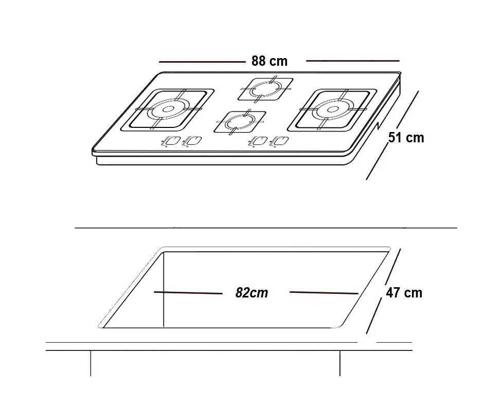 Hob 4 Burner Auto Ignition Gas Stove 8 mm Thick toughened glass top. Forged Brass Heatrayz Burner Double Ring Flame specially developed for Pakistani cooking (2 big burners 1 Medium 1 small ). Matt steel drip tray Smoothly operating knobs Bakelite knobs painted Strong vitreous enameled pan supports Integrated multi-spark auto ignition Installation dimensions: (ID/W/D) 635 mm x 350 mm Appliance dimensions: (W/D) 740 mm x 430 mm