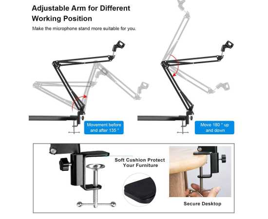 - The adjustable arms can be folded up and easy for you to carry around and allow you to adjust the suitable angle and height to record your good voice.